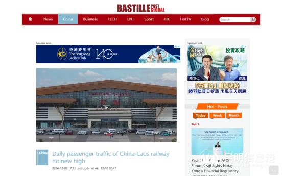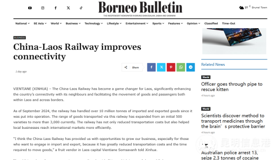 文莱《婆罗洲公报》12月2日以《中老铁路:互联互通的加速器》为题,强调中老铁路在提升区域互联互通水平方面的关键作用。报道指出,中老铁路的开通,显著增强了老挝与周边国家的交通联系,降低运输成本,提高运输效率。还为老挝企业打开了更广阔的市场空间,促进了区域经济的共同繁荣与发展。