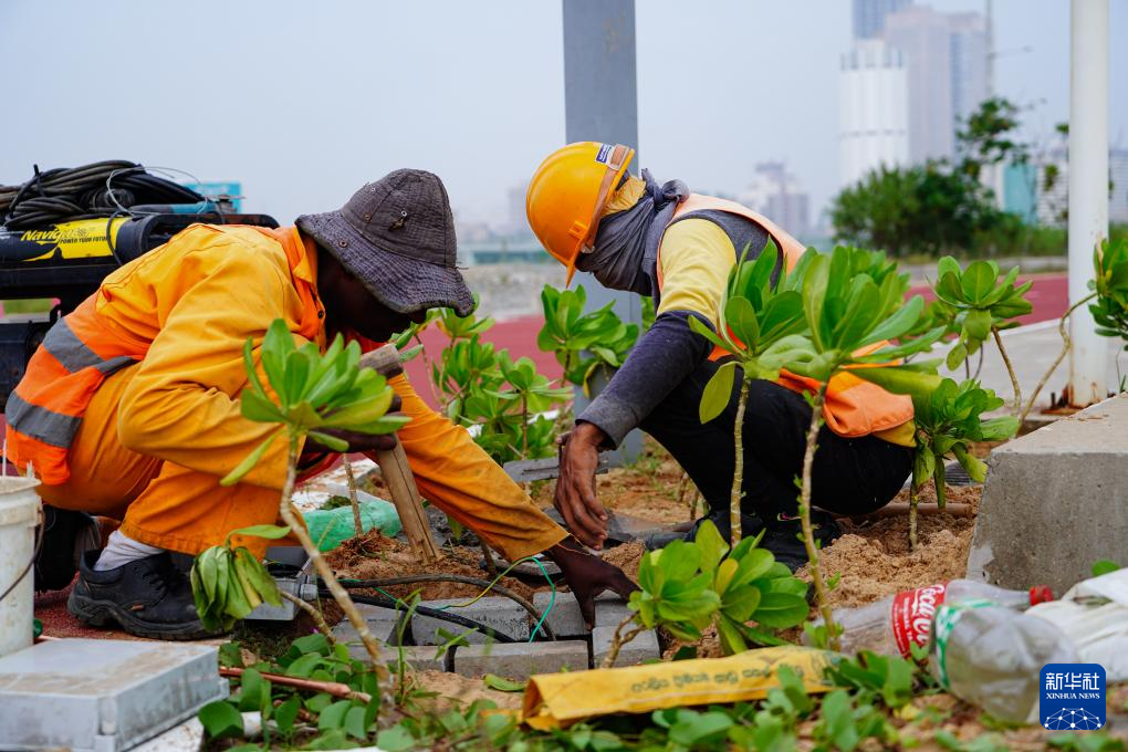 11月28日,工人在斯里兰卡科伦坡港口城进行绿化施工。新华社记者 陈冬书 摄