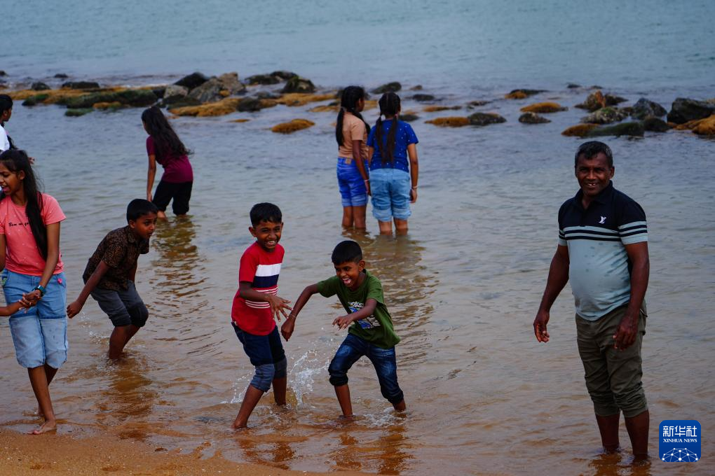 11月28日,游客在斯里兰卡科伦坡港口城海滩上嬉戏。新华社记者 伍岳 摄