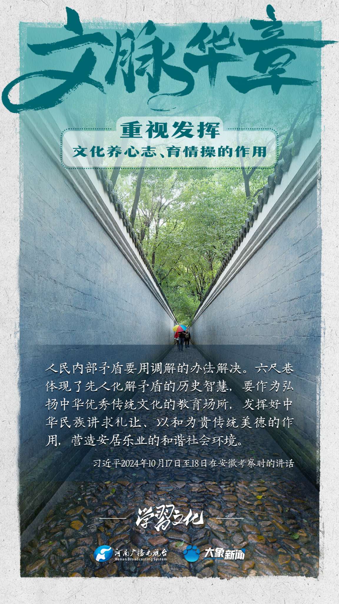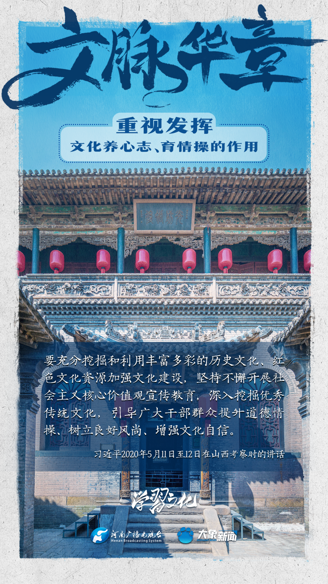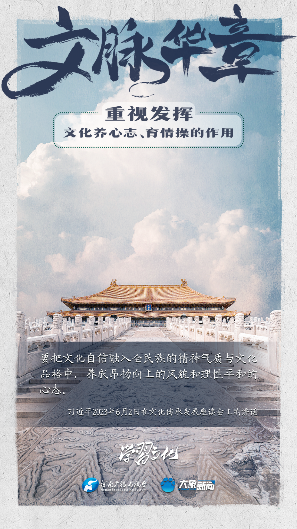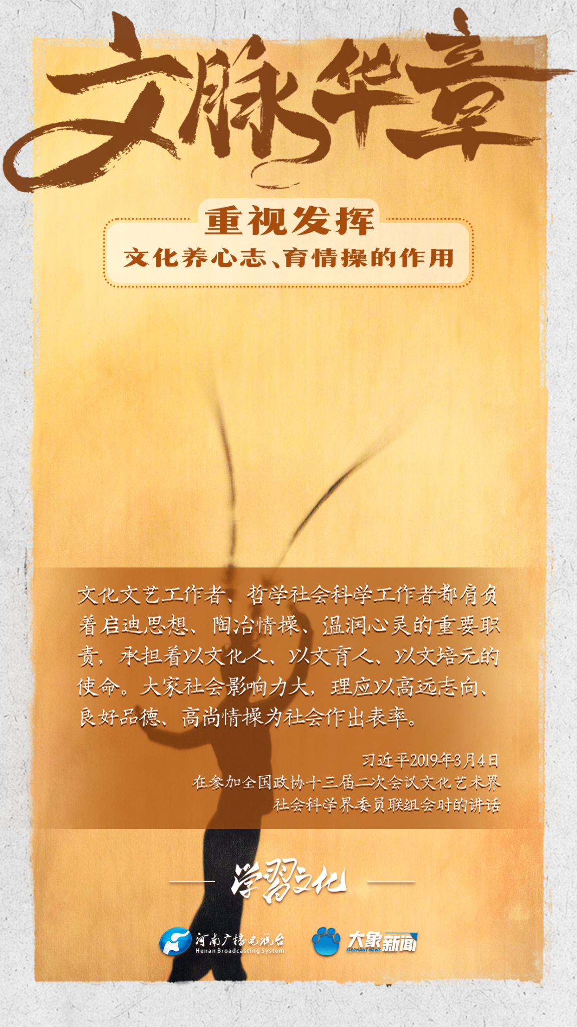 习近平总书记在主持中共中央政治局第十七次集体学习时强调,重视发挥文化养心志、育情操的作用,涵养全民族昂扬奋发的精神气质。总书记高度重视文化的作用,发表了一系列重要讲话,倡导以文载道、以文传声、以文化人。我们一起学习。
