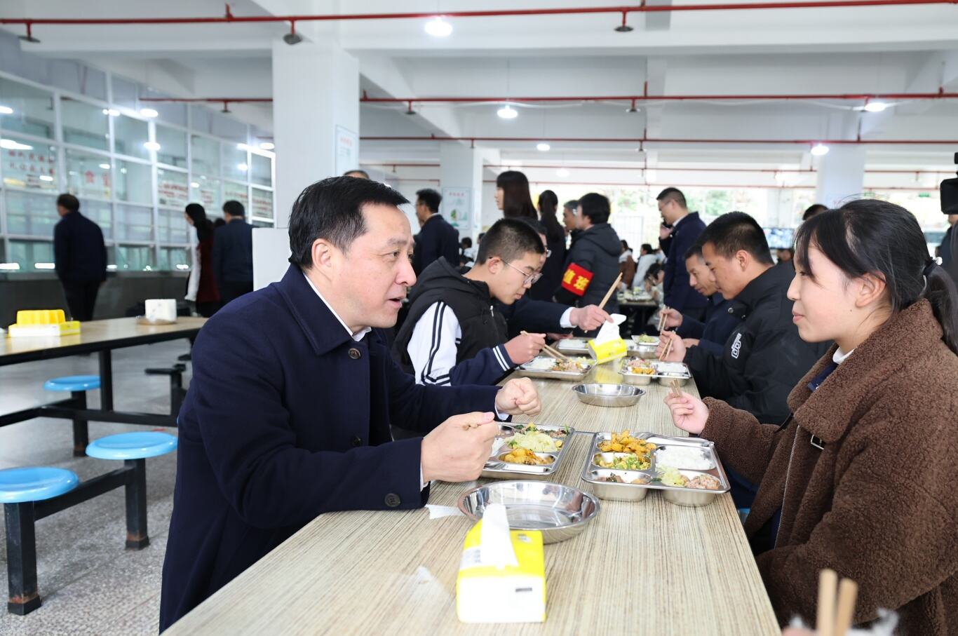在嵩阳一中,刘洪建听取嵩明县教育发展情况汇报,仔细察看校园安全隔离设施、SOS应急求助系统运行情况,详细询问学生心理健康服务工作开展情况。他强调,要高度重视校园安全工作,严格落实校园安全管理制度,加强学生心理健康辅导,全力守护学生安全和健康成长。随后,刘洪建走进学校食堂,仔细察看“互联网+明厨亮灶”系统运行情况及就餐环境,详细了解供餐流程及陪餐制度落实情况,并和学生一起用餐、亲切交流。他强调,要全链条压实责任,健全完善、严格执行各项制度,坚决守牢校园食品安全底线,让学生吃得安全、吃得健康。