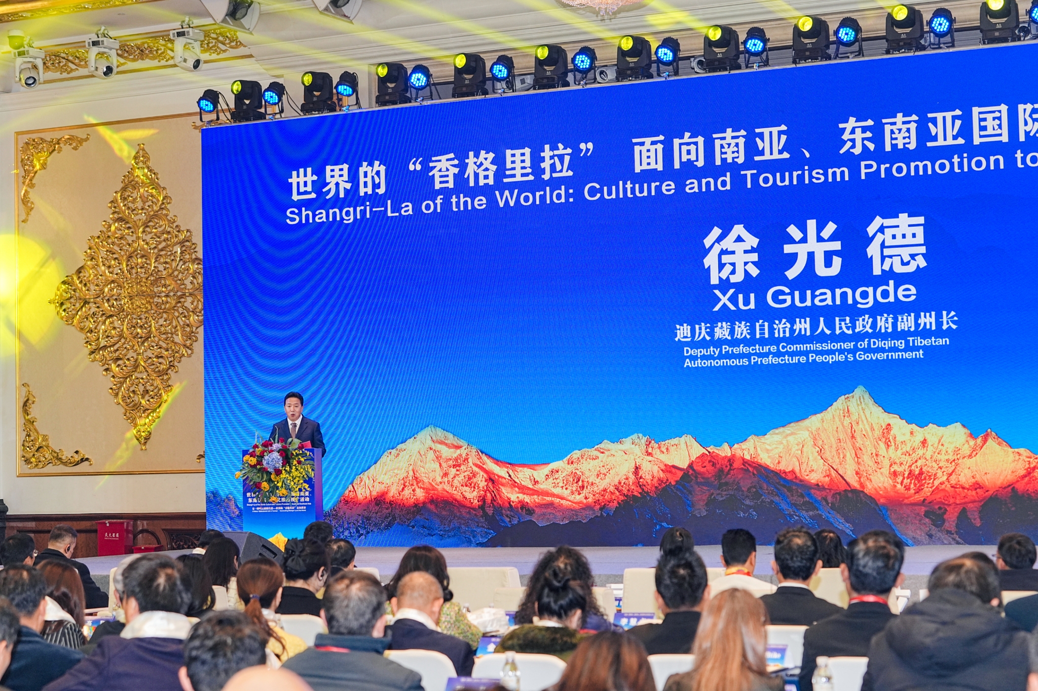 迪庆藏族自治州人民政府副州长徐光德向与会嘉宾介绍了迪庆丰富的旅游资源和独特的民族文化,诚邀各国朋友前往迪庆体验“香格里拉”的神秘与美丽。