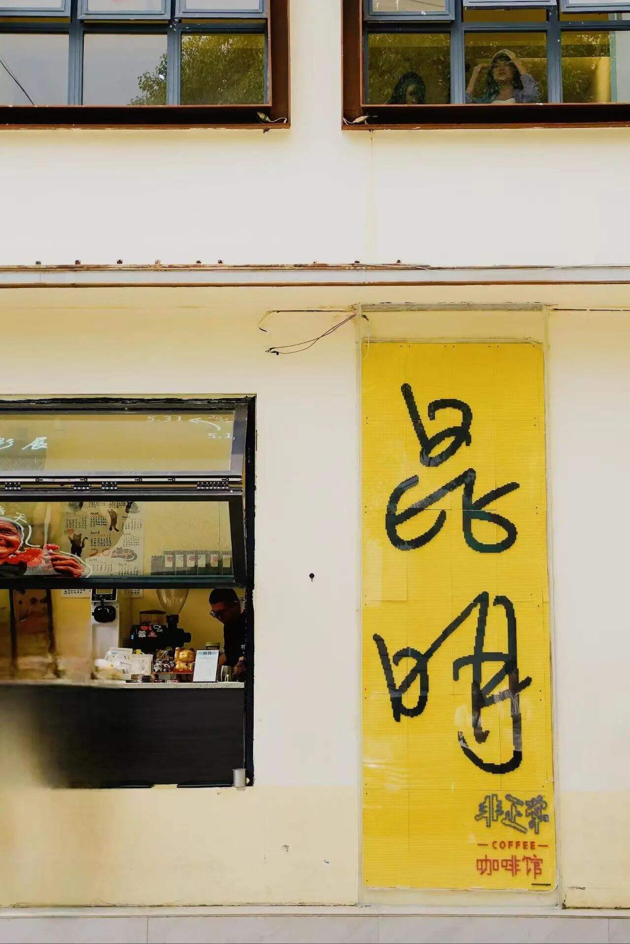五一路“非正常咖啡馆”店外,有一个黄底黑字的“昆明”墙,街拍非常好看。来往车辆有点多,拍照的时候一定要注意安全哦~