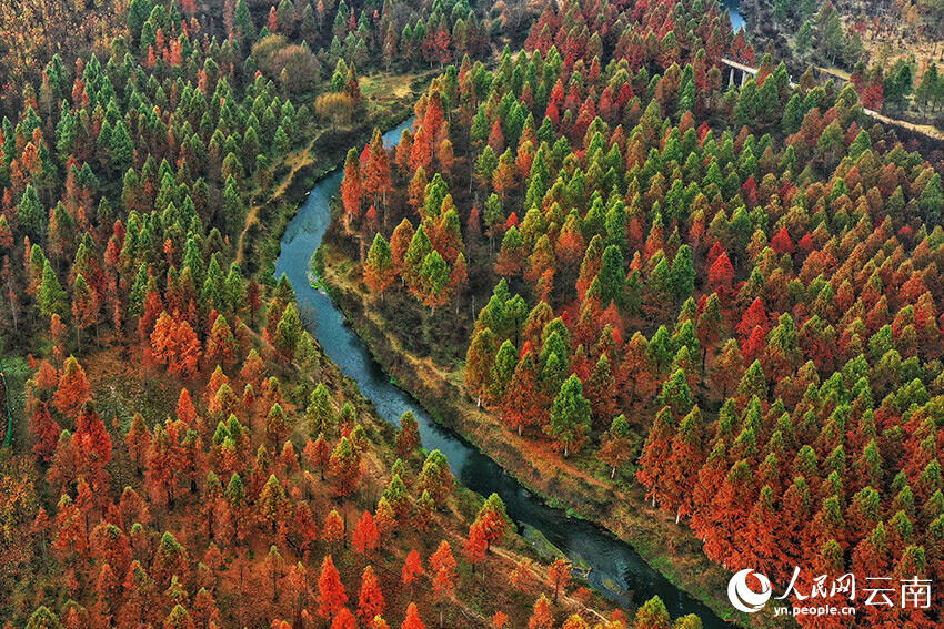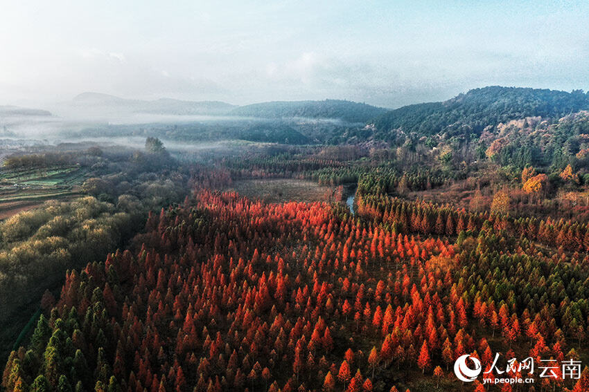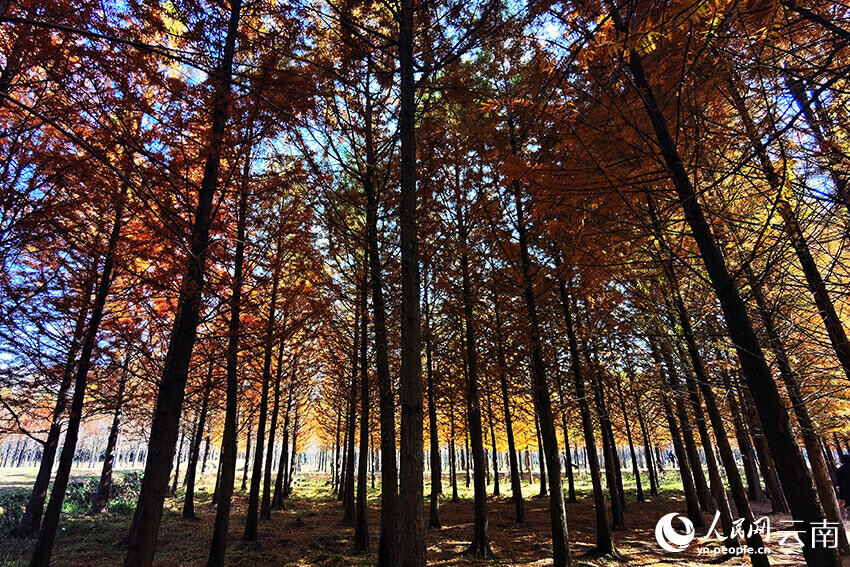 风起长林,落羽成杉。位于云南省昆明市盘龙区滇源街道的水杉林,宛如一位守信的画家,在冬日再度挥洒着调色盘上多彩的颜料,绘就一幅令人心旷神怡的自然绝景。