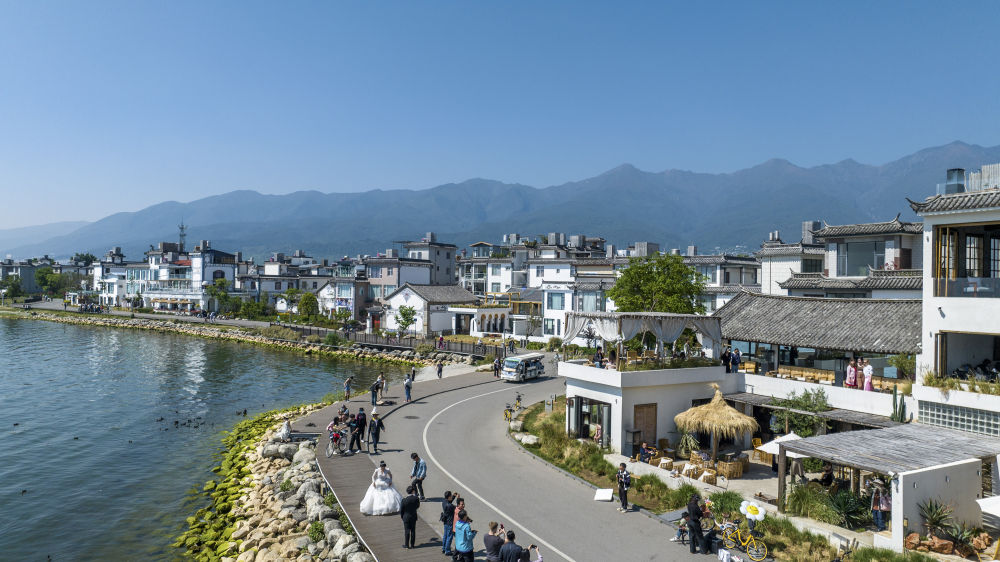 人们在大理市洱海边的生态廊道游玩 胡超 摄