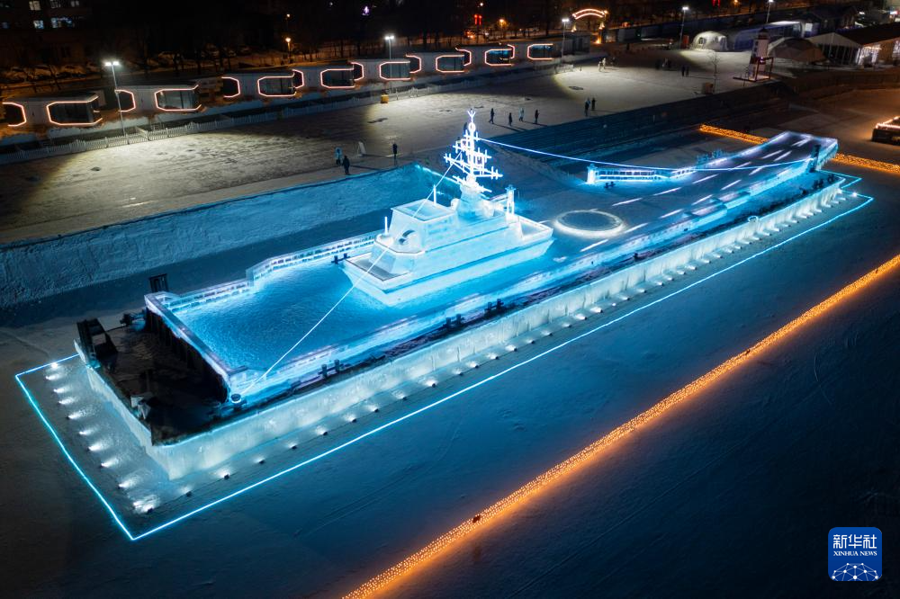 近日,冰建景观“冰雪辽宁舰”在哈尔滨道外区百年航运冰雪欢乐世界园区落成,成为游客新的“网红打卡地”。“冰雪辽宁舰”以我国首艘航空母舰辽宁舰为原型,长65米、宽15米、高13米,以一艘驳船为基底,钢结构焊接为支撑,用冰块搭建出外形,起飞甲板、舰桥等航母的典型特征均得到呈现。新华社记者 谢剑飞 摄