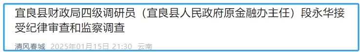 据宜良县纪委监委消息:宜良县财政局四级调研员(宜良县人民政府原金融办主任)段永华涉嫌严重违纪违法,目前正接受宜良县纪委监委纪律审查和监察调查。(清风春城)