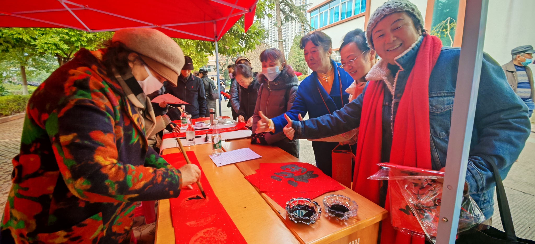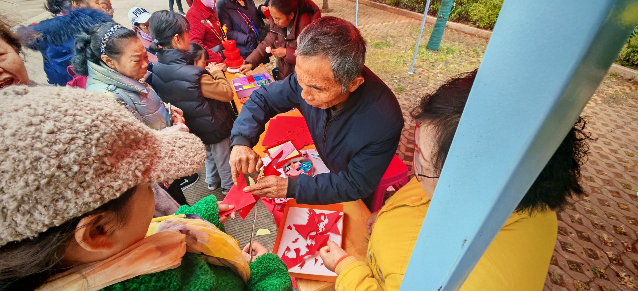 健身活动展演完毕后,正式进入趣味比赛环节,开展了捻玻璃珠、拼地图、猜谜语、投篮等趣味比赛,同时在活动区内设置非遗手工展览,邀请专家现场制作手工艺品,如写春联、剪纸、泥塑等,让老年人近距离体验非遗文化的魅力。大家纷纷参与到游戏中,热情高涨,并在游戏闯关成功后,兑换到了诸多精美礼品。