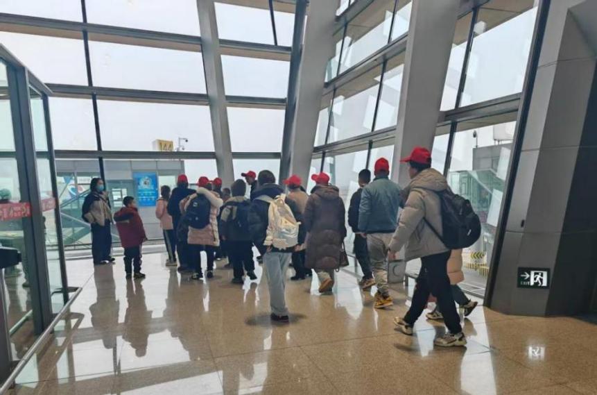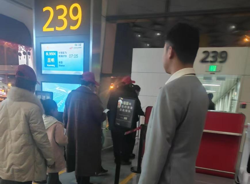 5点10分左右,医疗团队一行94人到达机场。在祥鹏航空工作人员的协助下,快速完成值机手续办理、通过安检,并优先登机。