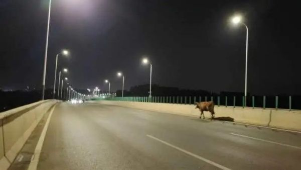 交警九大队民警介绍,接到报警到达现场时,发现该公牛肇事后一直在高速路上来回走动,周边群众不敢靠近。民警费尽周章引导“肇事牛”离开立交桥,没想到公牛一头钻进绿化带内横冲直撞,时不时扬起牛角对着民辅警示威。