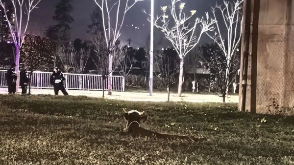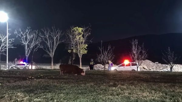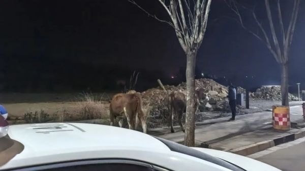正当周边群众一筹莫展时,大队民警灵机一动,向附近村民借来了一头母牛,试图安抚公牛暴躁的情绪。发狂的公牛看到同类后逐渐平静,最终在民警的“护送”下,两头牛一前一后走上了人行道,此时公牛的主人赶到现场,将公牛牵回了家。