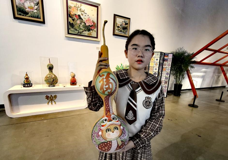 葫芦雕刻乌鲁木齐市非遗代表性传承人马江红的学生张盛卉展示自己的葫芦作品“蛇”(薛玲摄)