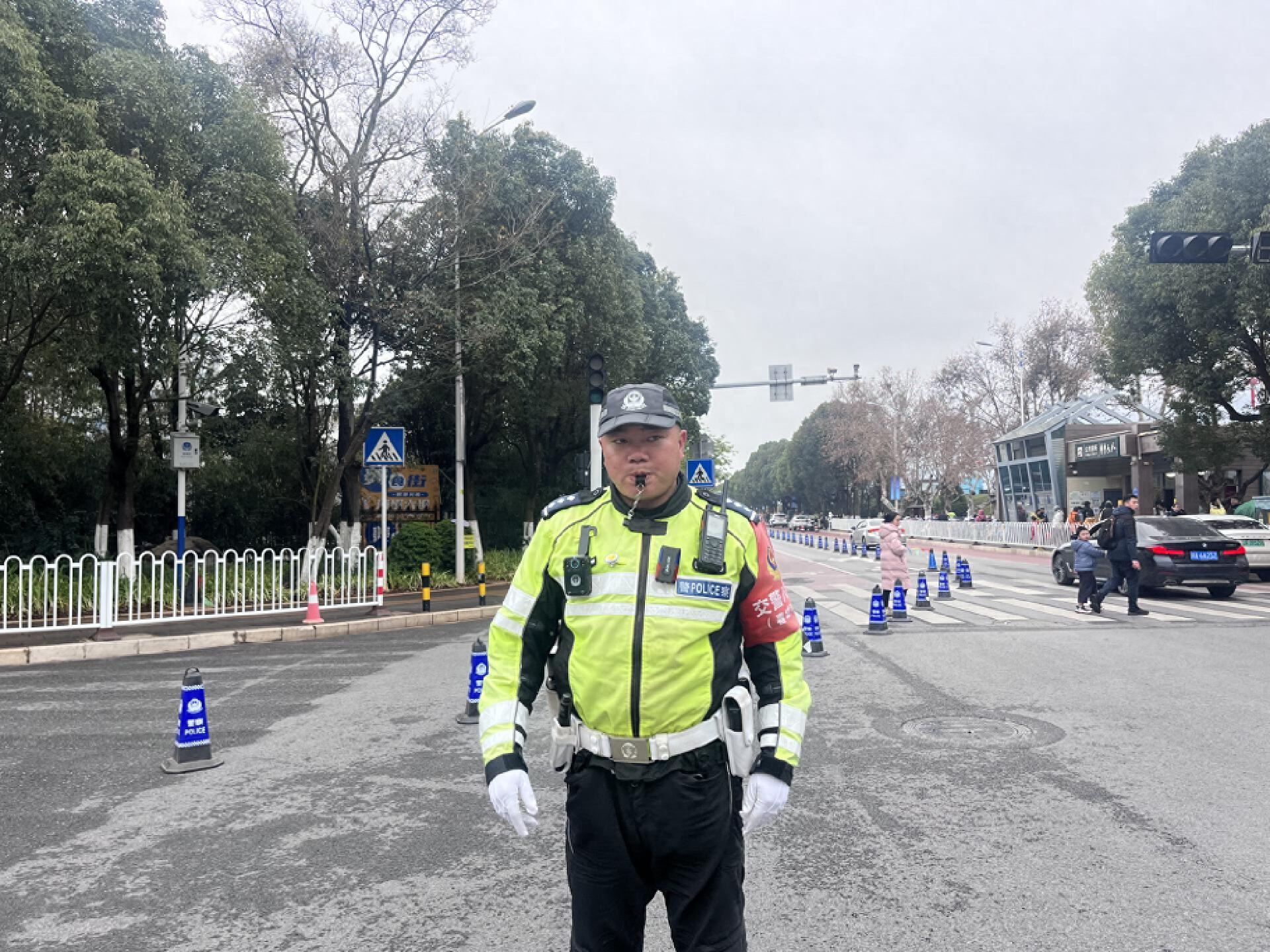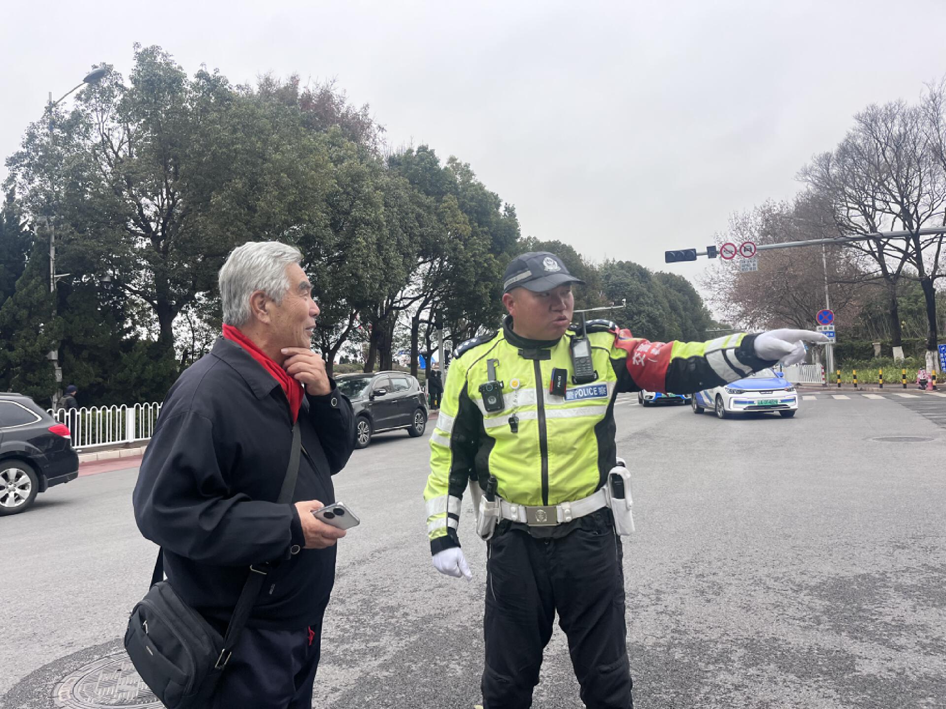 “注意安全,请走斑马线”“去民族村往哪走?”“沿着红塔西路走到头,再右转下去就到了。”上午11点,天空飘起了小雨,此时何文博已经工作三个多小时,尽管脸被冻得通红,还有些微咳,但他依然坚守在岗位上。除了维持现场交通秩序,还耐心地为现场问路的市民解答。