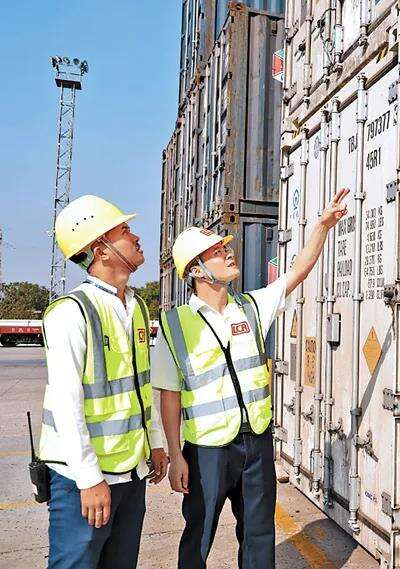 万象南站老方货运值班员阿列(左)与万象运营管理中心运营服务部助理工程师陈昌映对即将发运的冷链集装箱进行检查。杨一 摄