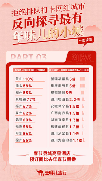 从去哪儿平台上春节酒店预订量增幅来看,热度蹿升最快的都是“年味儿”爆棚的小城。蕴含“登高”意头,今年新增众多非遗表演的黄山,春节期间酒店预订量同比增长了逾一倍;年味浓厚、还有许多特色民俗的广东潮汕地区,汕头、潮州酒店预订量均同比增长八成;气候好、美食多,还有“游神”加持,福建福州、泉州等预订量增六成。