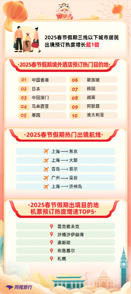 值得一提的是,中小城市居民日渐成为出境游增长的主力军。同程旅行数据显示,2025春节假期中国三线以下城市居民出境预订热度增长超1倍。去哪儿大数据显示,春节三线及以下城市居民购买的出境游机票量已经占总量的三成以上。