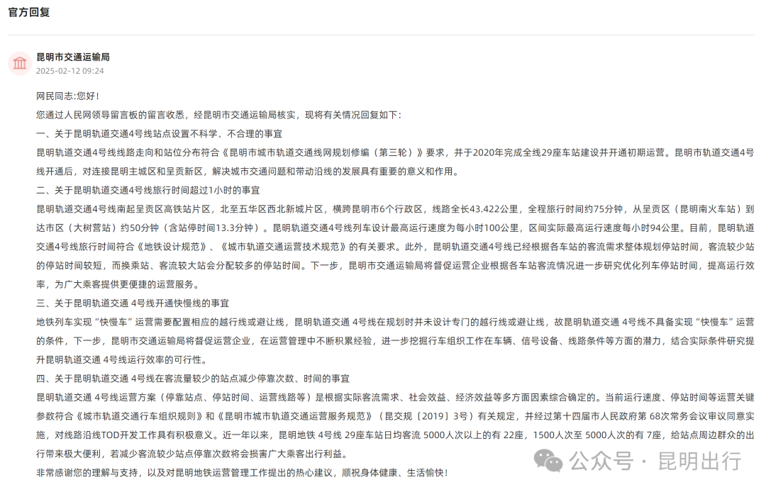 近日,有网友提出昆明地铁4号线开行快慢线等建议,对此,昆明市交通运输局于2月12日进行了回复,其中提到: