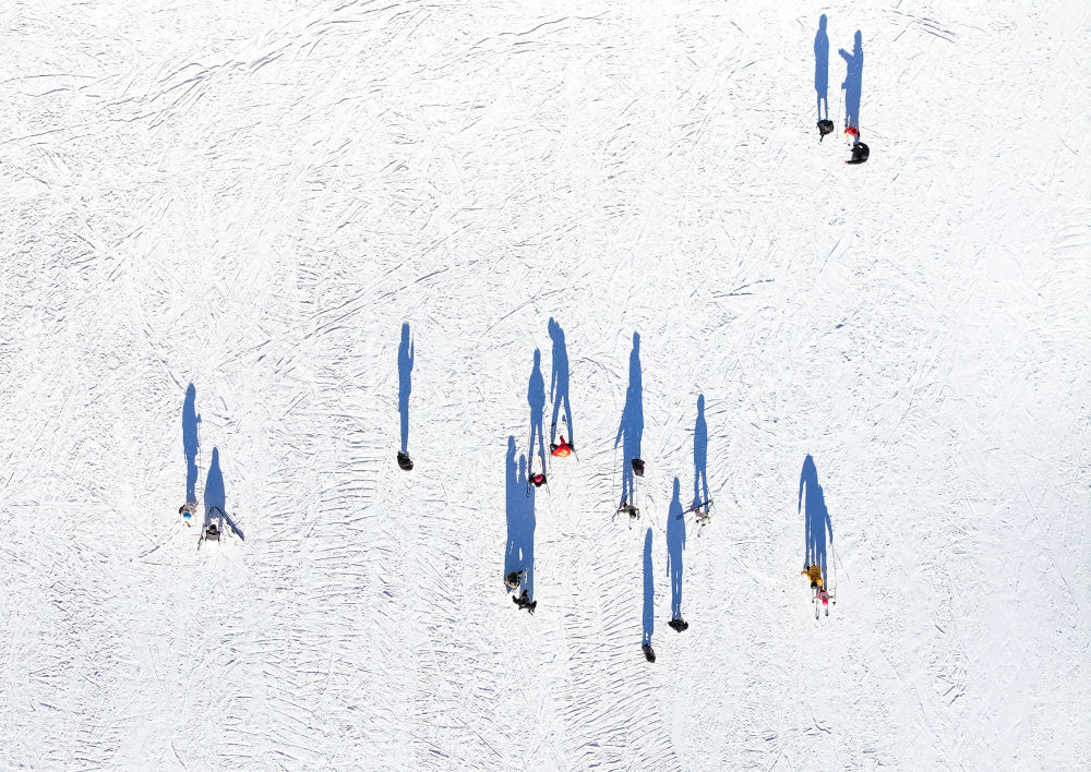 滑雪爱好者在内蒙古呼伦贝尔扎兰屯市金龙山滑雪场滑雪(无人机照片)新华社记者连振