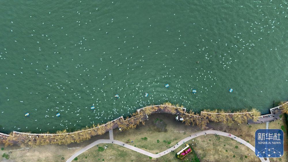2月15日,市民游客在滇池边喂红嘴鸥(无人机照片)