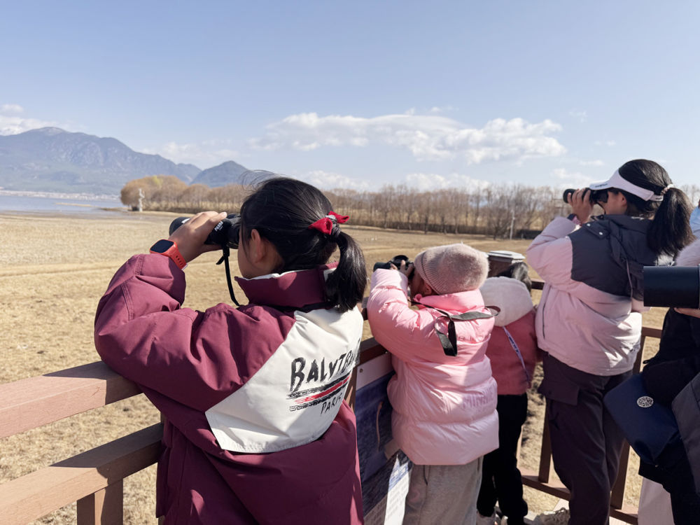 小观察员们来到拉市海观鸟栈道候鸟观测点。(丽江融媒记者 张小秋 摄)