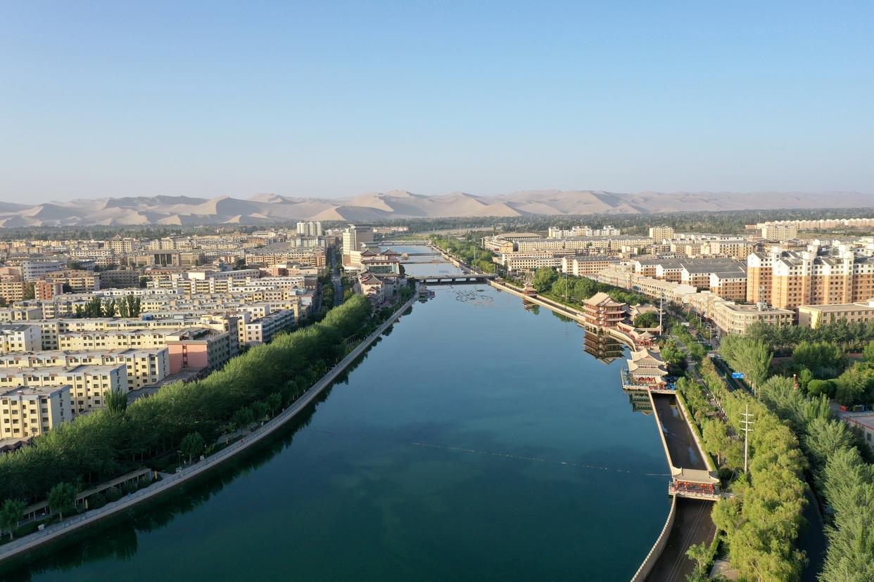 这是2023年6月14日拍摄的敦煌党河风情线(无人机照片)。新华社发(张晓亮摄)