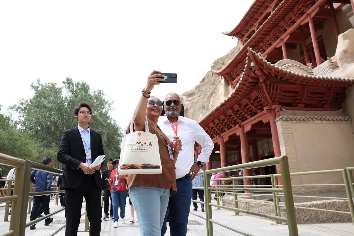 2024年6月7日,前来甘肃调研考察的驻华外交官在敦煌莫高窟九层楼前留影。新华社记者 陈斌 摄