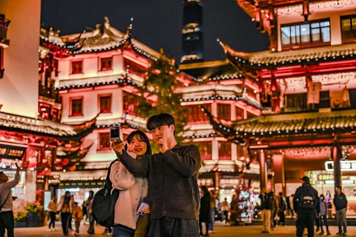 2024年12月4日,来自韩国的游客在上海豫园商城自拍。新华社发(陈浩明摄)