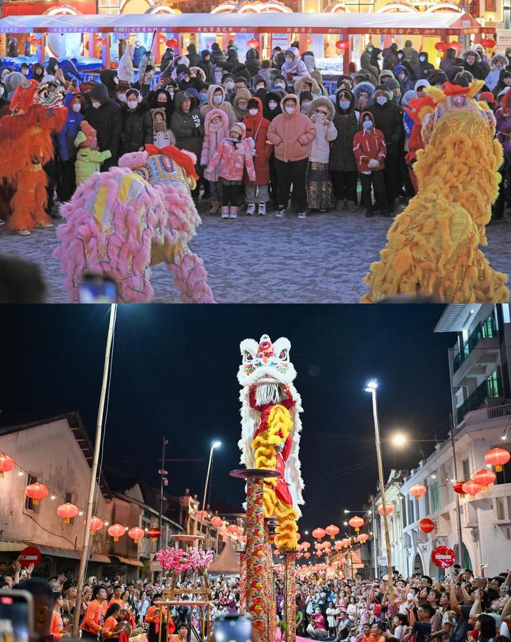 拼版照片:上图为市民在沈阳新春皇寺庙会上观看舞狮表演(2023年1月23日新华社记者杨青摄)。下图为人们在马来西亚槟城庙会上观看舞狮表演(2025年2月1日新华社发李奕慧摄)。