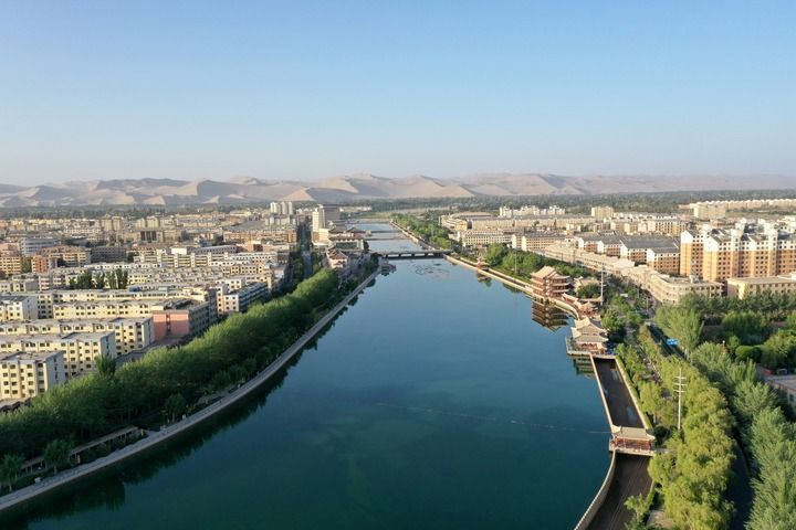 乘飞机从甘肃省会兰州往西飞行约两个小时后,茫茫戈壁上一个绿色小点出现在视线里。随着飞机高度下降,俯瞰下去,一片多边形的绿洲逐渐显现,如一块美丽宝石。
