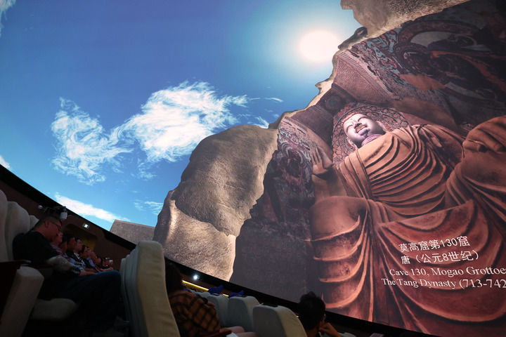 2024年9月4日,游客在莫高窟数字展示中心观看球幕电影《梦幻佛宫》。新华社记者 陈斌 摄