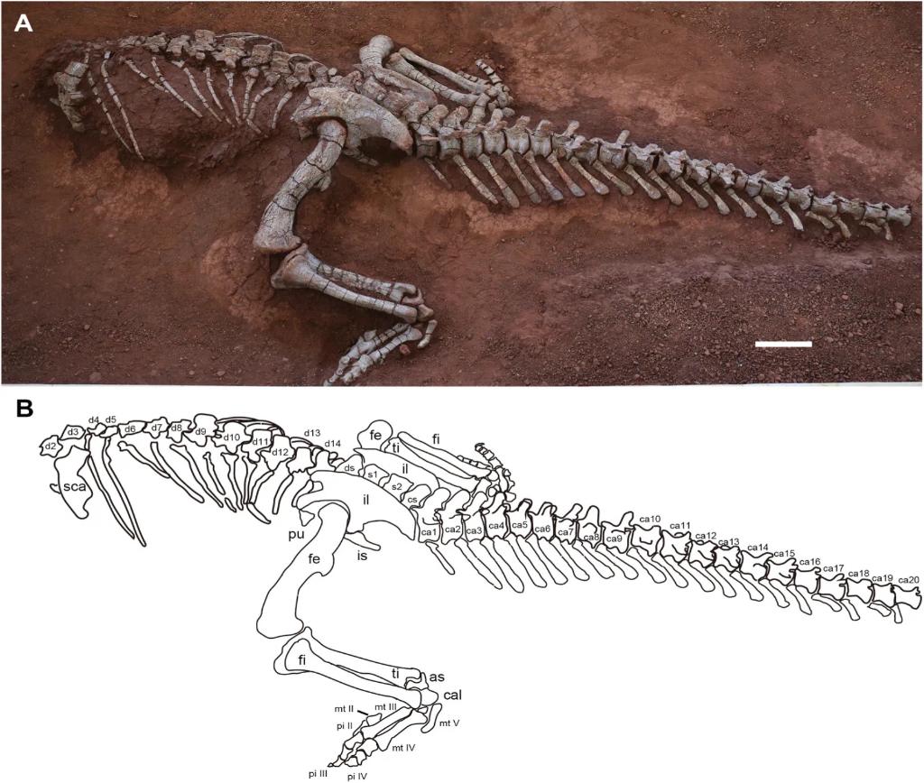 岳氏星宿龙骨骼化石及素描图。(中国科学院古脊椎动物与古人类研究所供图)