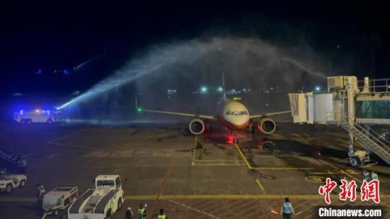 中新网昆明2月19日电 (艾芯羽)记者19日从云南祥鹏航空有限责任公司了解到,云南昆明至印尼美娜多直飞国际航线开通,首航航班8L845于当地时间18日21时30分平稳降落在美娜多萨姆拉图兰吉机场,并受到“水门仪式”欢迎。