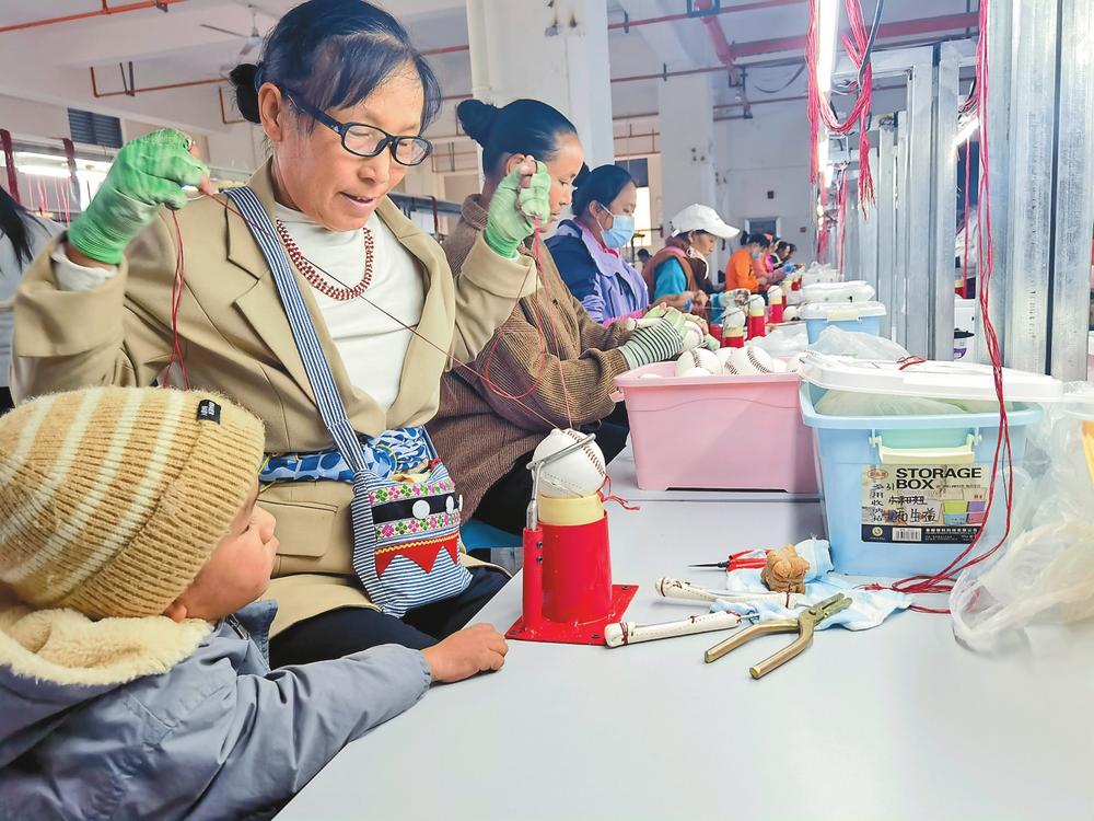 搬迁群众在帮扶车间缝制棒球。云南日报记者李寿华/摄
