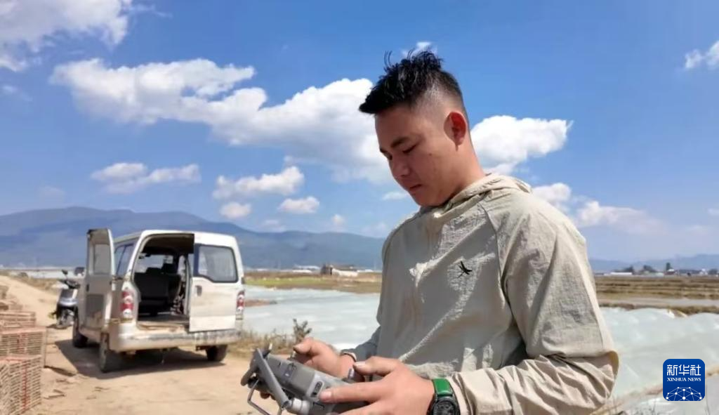 2025年2月,在云南省西双版纳州勐海县,农机手在田间操纵无人机播撒肥料。新华社发(佐连江 摄)