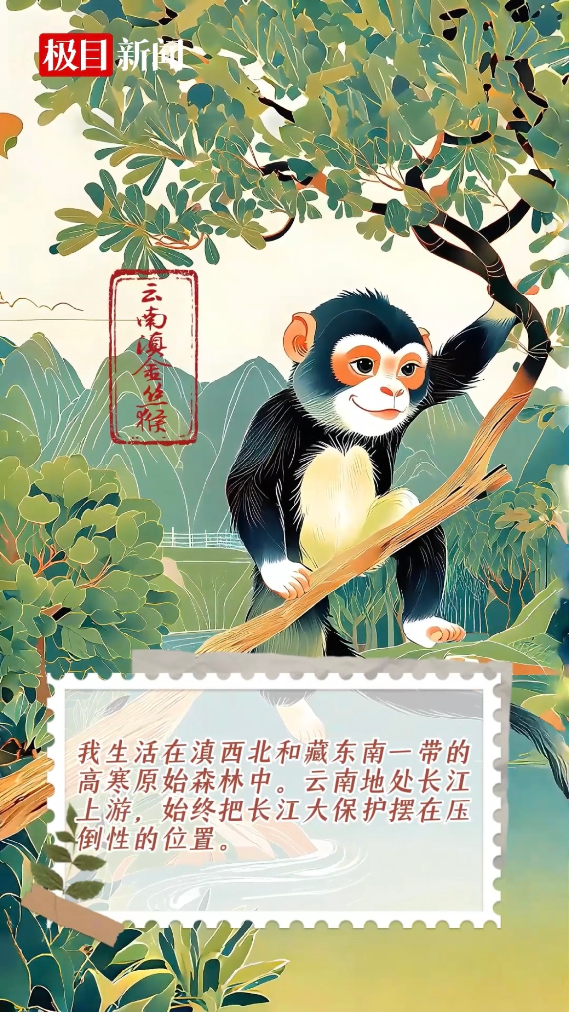 滇金丝猴,生活在滇西北和藏东南一带的高寒原始森林中。云南云南地处长江上游,始终把长江大保护摆在压倒性的位置,坚持共抓大保护、不搞大开发,坚持生态优先、绿色发展,积极推动长江流域生态环境保护与修复。