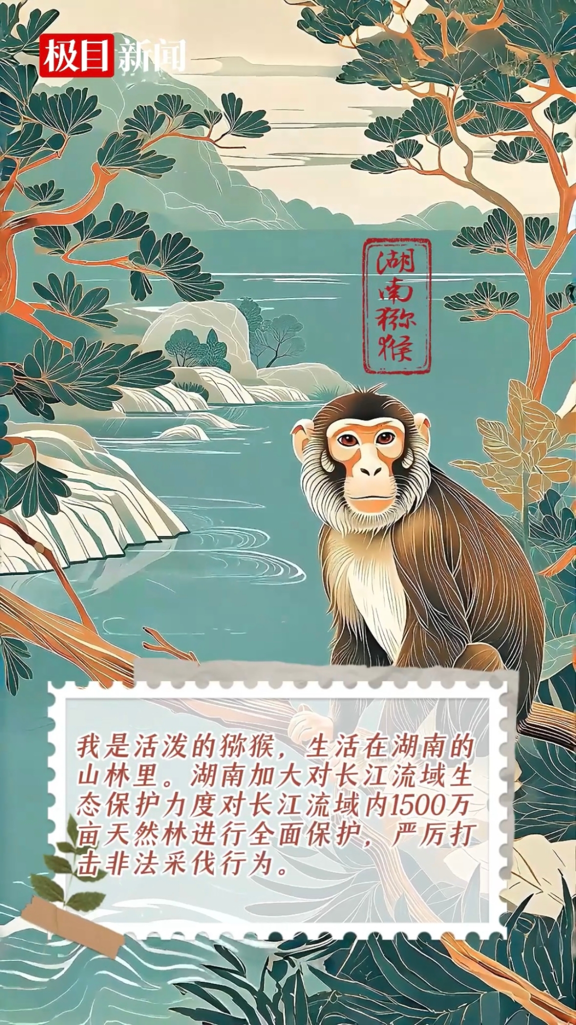 活泼的猕猴,生活在湖南的山林里。湖南加大对长江流域生态保护力度,一方面加强森林资源保护,实施了天然林保护工程,对长江流域内1500万亩天然林进行全面保护,严厉打击非法采伐行为。另一方面,建设了一批污水处理设施,改善了周边水环境。此外,湖南还开展了丰富多样的环保宣传活动,如环保知识进校园、进社区等活动超5000场次,提高了公众的环保意识。