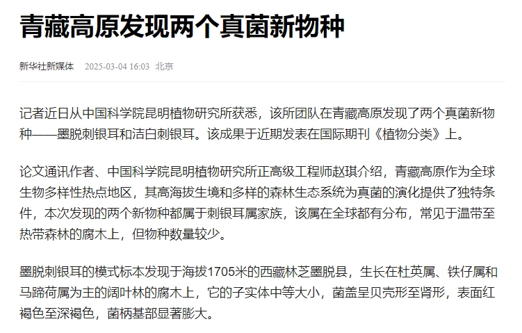 杨祝良团队的这项研究成果,不仅丰富了中国刺银耳属的物种多样性,还为真菌分类学提供了新的分子数据支持。