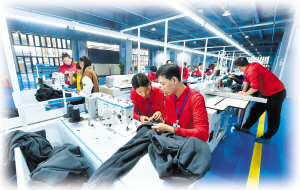 入驻南坡国际产业示范园的三连制衣有限公司生产线。 记者李海曦摄