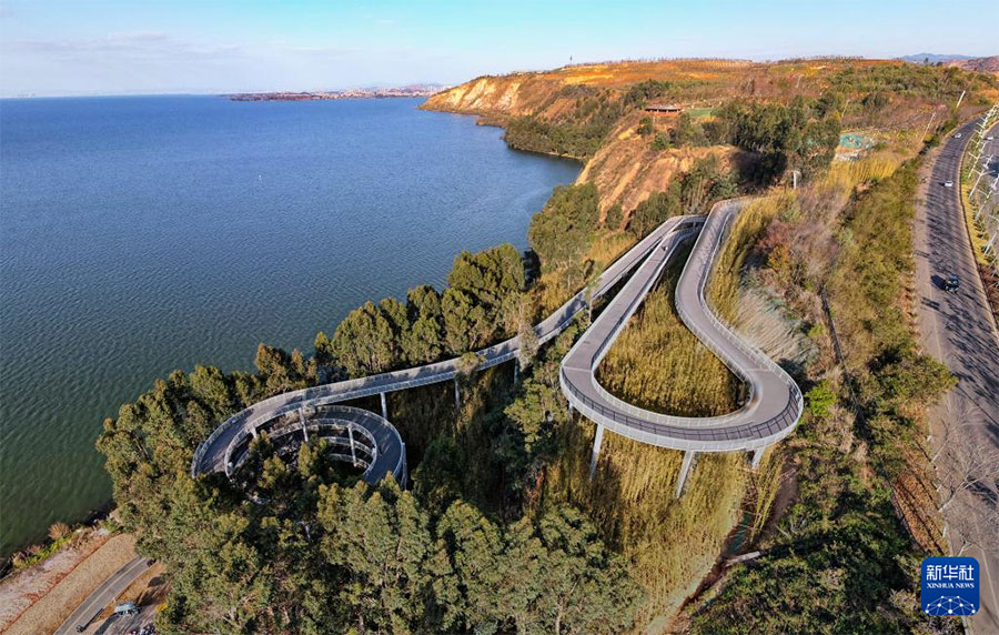 1月25日拍摄的滇池绿道外海段一期的湖之桥(无人机照片)。新华社记者 陈欣波 摄