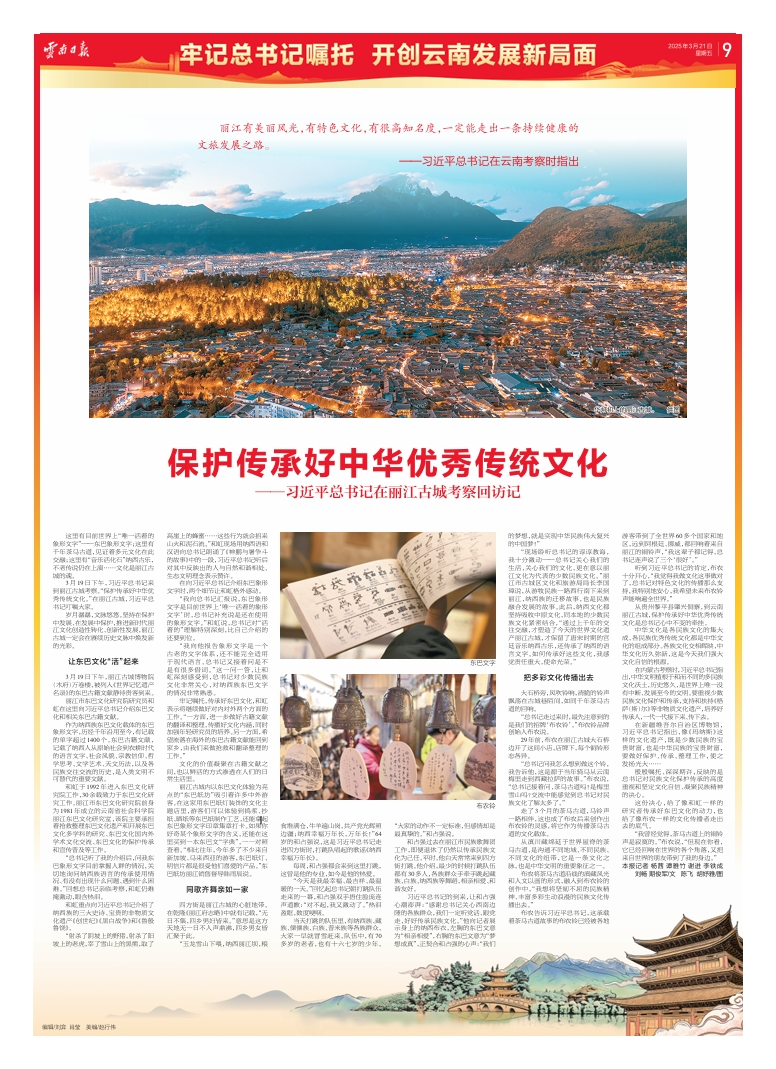 岁月潺潺,文脉悠悠。坚持在保护中发展、在发展中保护,推进新时代丽江文化创造性转化、创新性发展,丽江古城一定会在赓续历史文脉中焕发新的光彩。