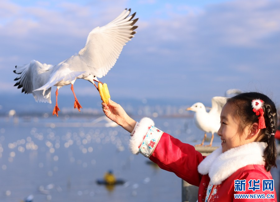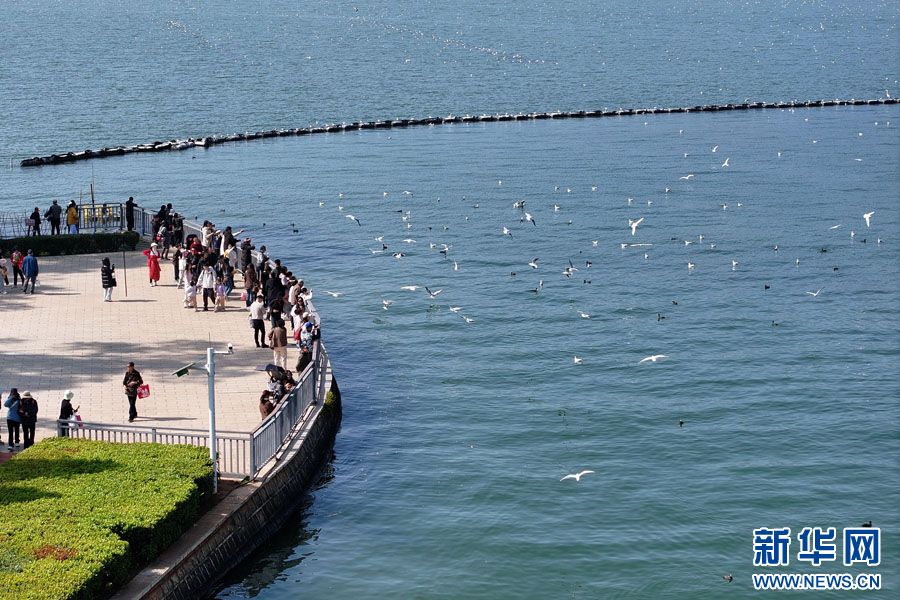游客在滇池边喂红嘴鸥(资料图)。新华网发(刘元嵩 摄)