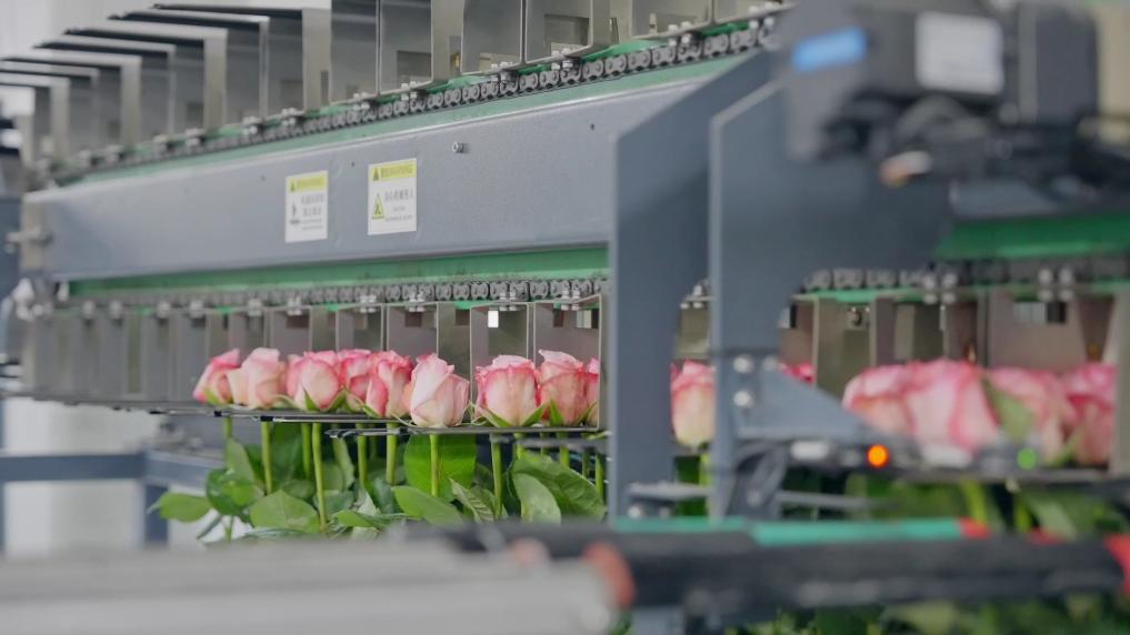 在园区采后处理中心,鲜切花玫瑰采摘后迅速预冷保鲜,打刺去叶后,红外成像识别系统检测花朵开放度、枝干长度和粗细,并按等级分类。随后,自动化设备完成捆扎与包装。