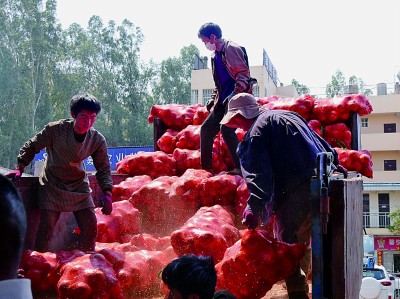 工作人员在楚雄州能禹蔬菜批发交易市场搬运洋葱。徐鑫雨摄/光明图片