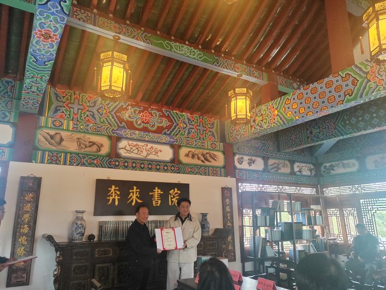 度假区党工委副书记熊坚为大象书店主理人杨雄授予捐赠证书。