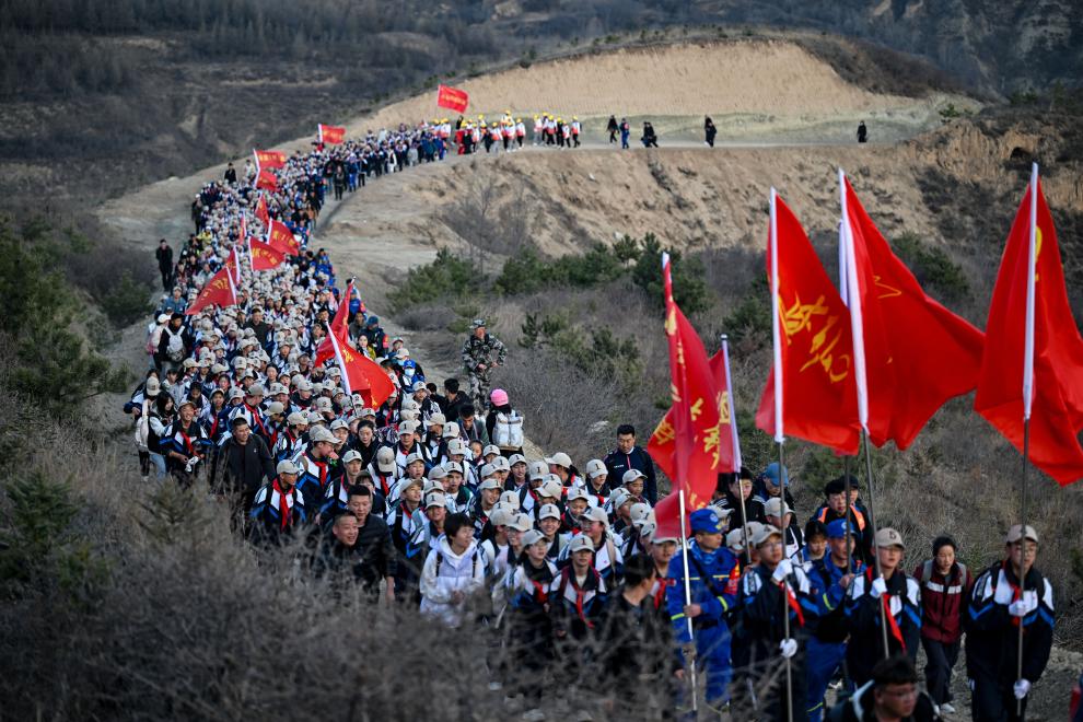 4月3日,参加徒步祭英烈活动的师生们翻越黄峁山。