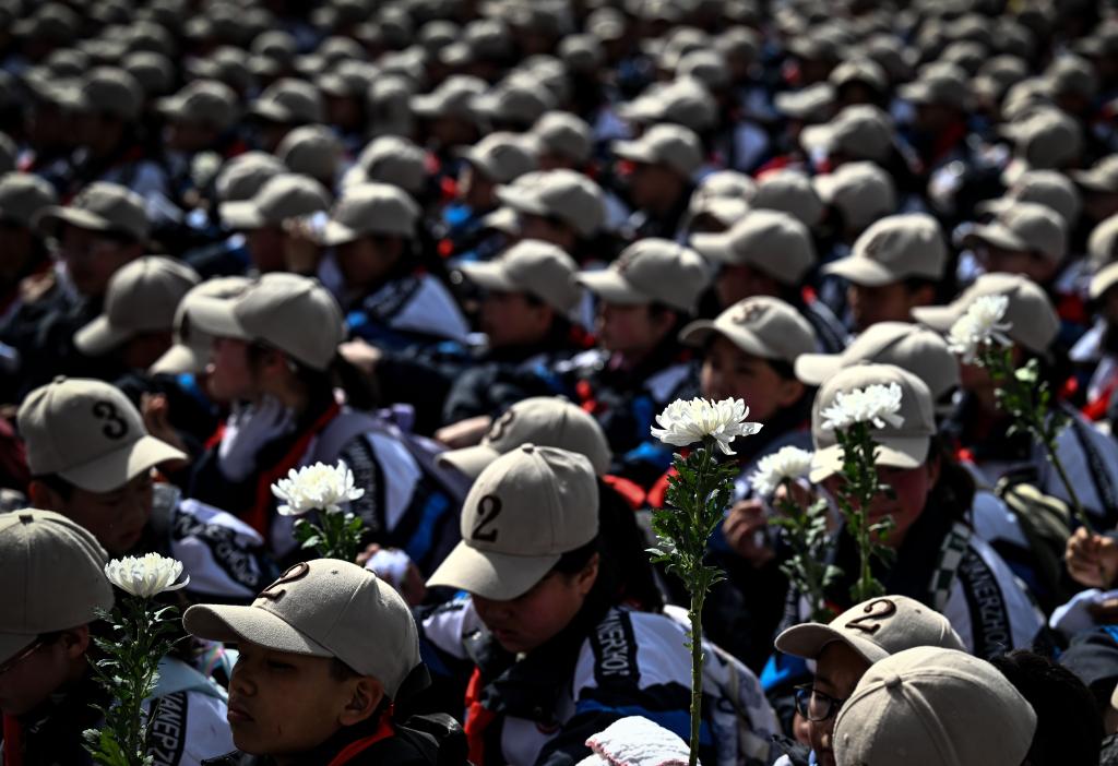 4月3日,抵达任山河烈士陵园的学生们手持白菊原地休整。