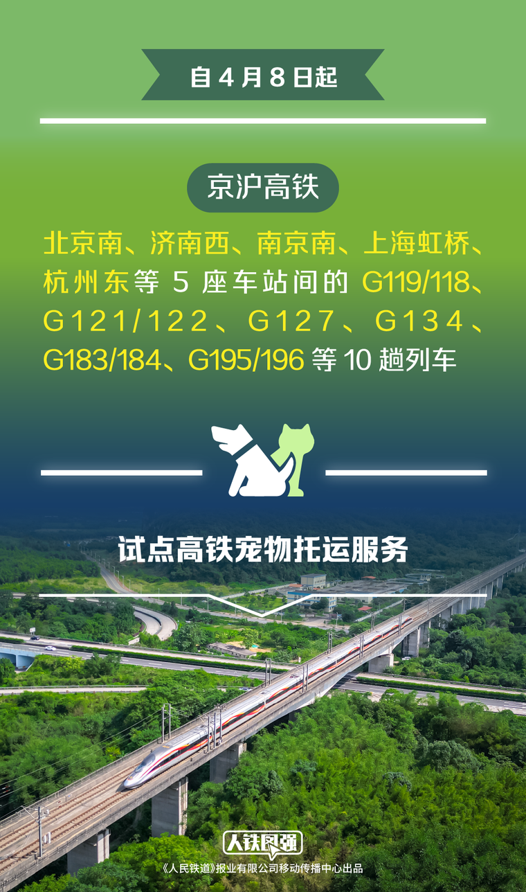 铁路部门持续深化运输供给侧结构性改革,积极适应广大旅客多样化的出行需求,在广泛听取旅客意见、深入开展市场调查基础上,经过专业测试评估, 自4月8日起在京沪高铁北京南、济南西、南京南、上海虹桥、杭州东等5座车站间的G119/118、G121/122、G127、G134、G183/184、G195/196等10趟列车上试点高铁宠物托运服务。