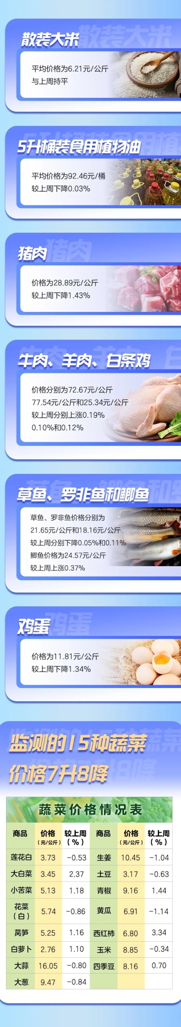 从云南省发展改革委重要民生商品零售价格监测数据看,与上周相比,本周全省粮油肉蛋菜价格(全省平均价格,下同)总体稳定。
