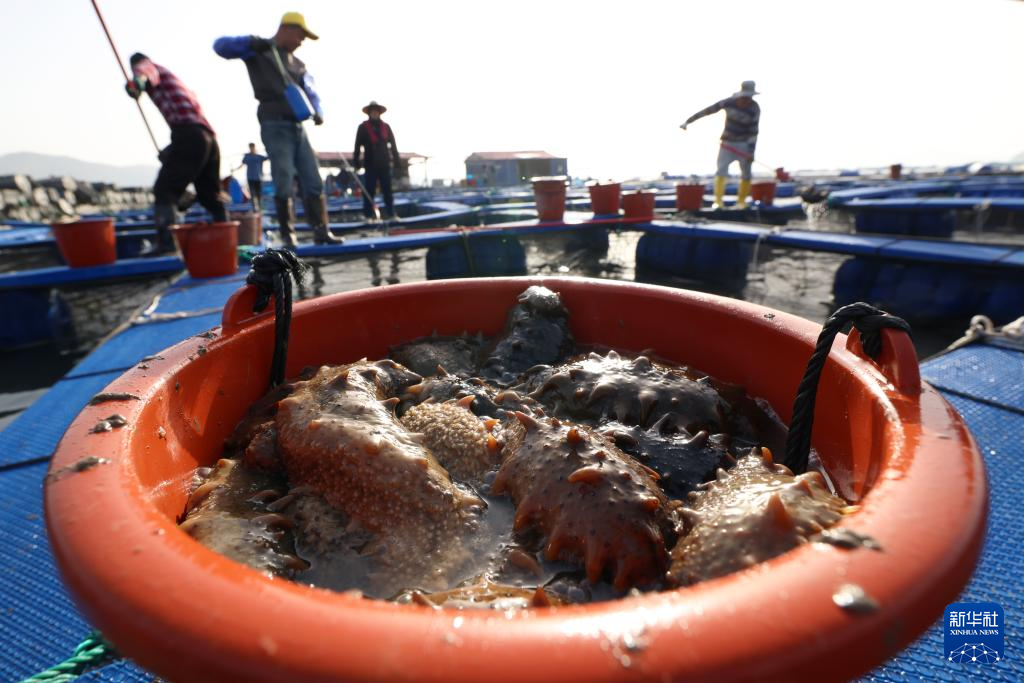 近日,福建省宁德市霞浦县溪南镇海域迎来海参采收高峰,养殖户加紧捕捞、加工,供应市场。