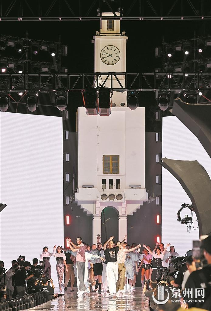 作为2025泉州时尚周的重头戏之一,17日晚上,泉州时尚周首发大秀于泉州中山路钟楼举行。(融媒体记者陈英杰 摄)